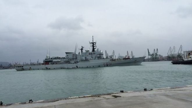 ناخدای ناوشکن ایتالیایی قسمت های مختلف این کشتی جنگی، از اتاق عملیات گرفته تا تجهیزات رزمی روی عرشه را به من نشان داد. در اتاق عملیات کشتی در کنار همه تجهیزات مدرن مثل رادار و نقشه های الکترونیک، یک نمودار مدل قدیمی نیز قرار دارد که در آن پرچم کشورهای حاشیه دریای سیاه مشخص شده اند. این کشورها عبارتند از ترکیه، رومانی، بلغارستان، اوکراین و اکنون ناحیه کریمه تحت کنترل روسیه نیز به آن افزوده شده است.