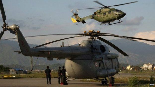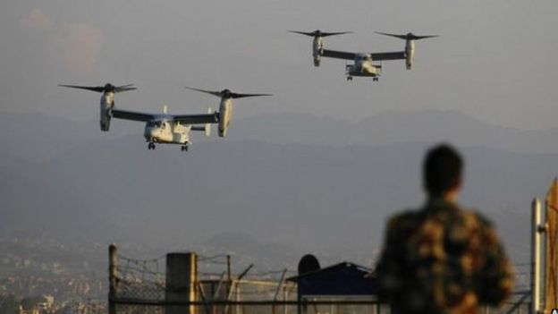 حدود ۱۰۰ تفنگدار دریایی آمریکا، دو هلی کوپتر و چهار هواپیمای آسپری که می تواند عمودی بلند شود اکنون وارد کاتماندو شده اند.