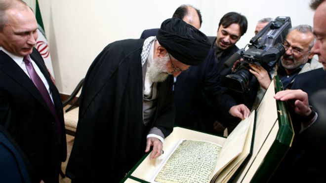 ولادیمیر پوتین، رئیس جمهور روسیه که برای شرکت در اجلاس سران کشورهای صادر کننده گاز به تهران سفر کرده در دیدار با رهبر ایران یک جلد قرآن خطی قدیمی به آیت الله علی خامنه ای هدیه داده است.