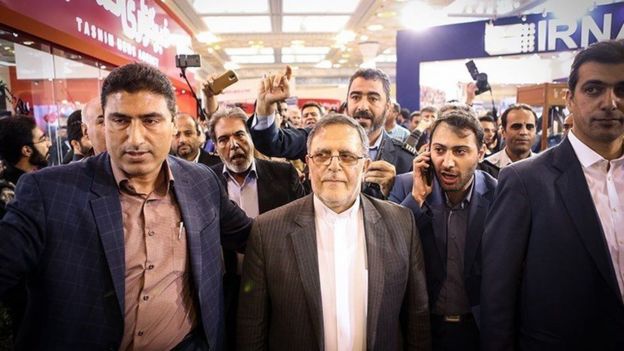 در تصاویری که از این تجمع منتشر شده دهها نفر در حال اعتراض به ولیالله سیف، رئیس بانک مرکزی دیده میشوند و به نظر میرسد که آقای سیف قصد دارد به سرعت محل نمایشگاه را ترک کند.